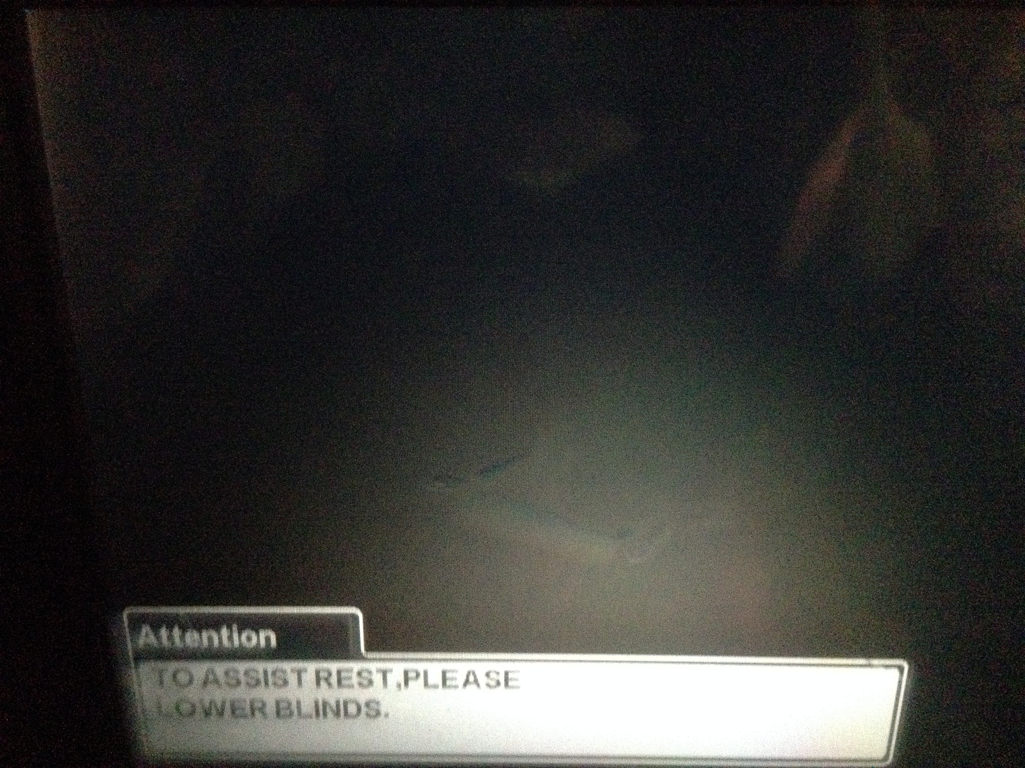 It turns out that most displays on planes feature low quality panels: low resolution, shallow color depth and – most relevant here – terrible contrast, especially at wide viewing angles.  Now bad viewing angles aren’t much of a problem on the horizontal axis – it prevents your neighbours from noticing that you’re watching Smurfs 2.  But bad viewing angles on the vertical axis – well, they produce the problem you can see above.